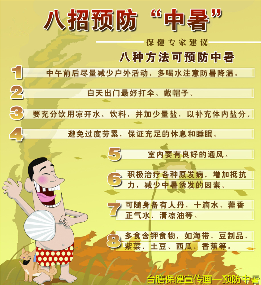 導致中暑的環(huán)境包括在高溫作業(yè)通風差的車間;露天受陽光直接暴曬的作業(yè);在散熱困難的擁擠人群中。空氣中濕度的增強易誘發(fā)中暑;除了高溫、烈日曝曬外,精神過度緊張、人員過于密集、工作強度過大、時間過長睡眠不足、過度疲勞等均為常見的中暑誘因。